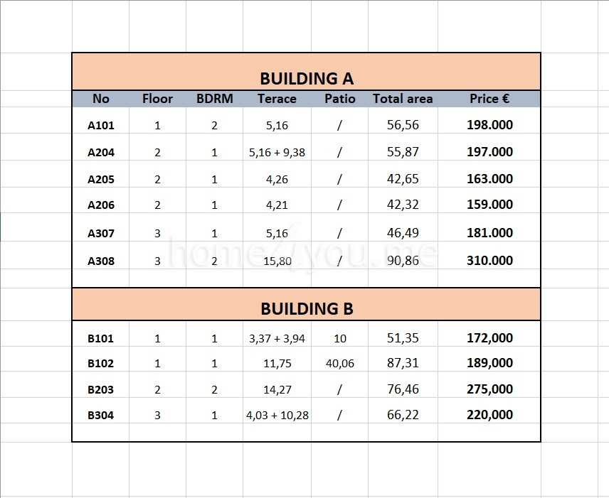 U svakoj zgradi nalaze se stanovi sa jednom i dve spavaće sobe, prostranim dnevnim boravcima i terasama. Stanovi u prizemlju imaju privatno dvorište (patio).